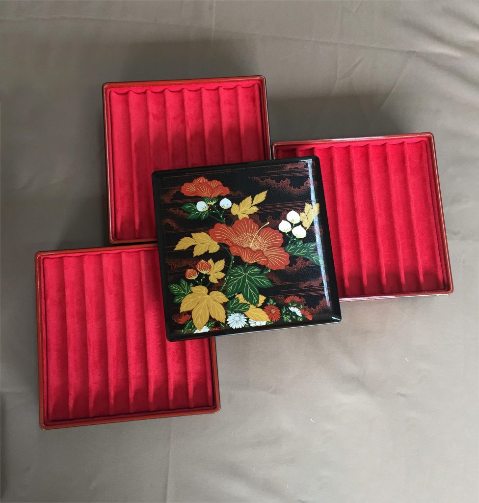 莳绘漆器是以金、银屑加入漆液中,干后做推光处理,显示出金银色泽,极尽华贵,时以螺钿、银丝嵌出花鸟草虫或吉祥图案,淡雅而优美的表现形式,不拘泥于自然景象的描写,将其归纳为纹样,比较自由的莳绘形式来表现绘画一般的效果。内搭细腻绒布,手感柔软,每支书写工具都有独立的笔槽,采用了U形笔槽的设计,带有防震防滑的效果,不易造成刮花,能更好地保护您收藏的书写工具。内饰可根据您的需求来定制!